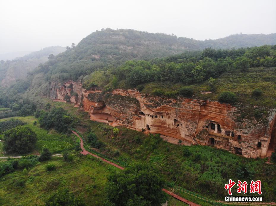 7月15日,航拍甘肅省平涼市涇川縣百里石窟長廊中的羅漢洞石窟。百里石窟長廊位于涇川縣境內,由512個石窟、5眼窟中石井組成,現(xiàn)存王母宮石窟、鳳凰山石窟、南石窟寺、丈八寺石窟、羅漢洞石窟、太山寺石窟等規(guī)模較大的石窟群,還有數(shù)量眾多的小石窟群。羅漢洞石窟遺存40余個窟龕,以北魏至清代風格為主。(無人機照片) 中新社記者 李亞龍 攝