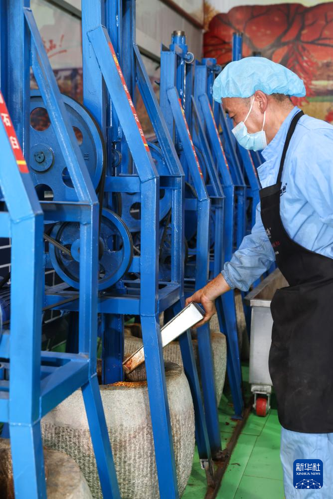 7月22日,工作人員在甘肅天水市甘谷縣安遠(yuǎn)鎮(zhèn)的辣椒烘干和加工車間里操作電動石臼。新華社記者 呂帥 攝