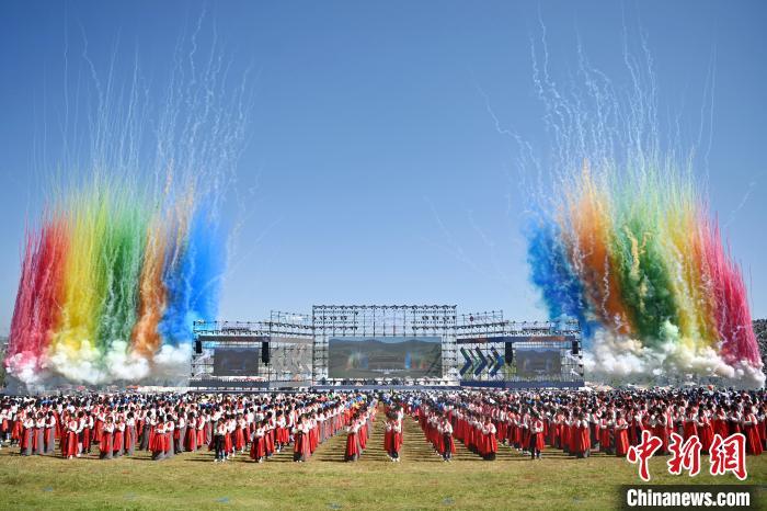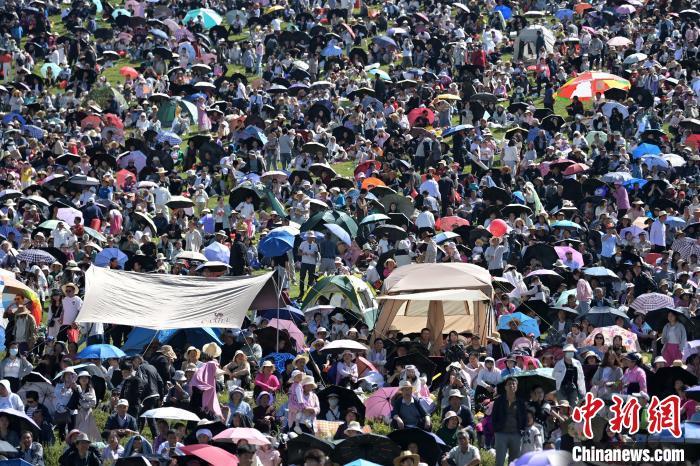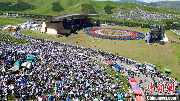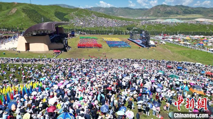 8月4日,第22屆九色甘南香巴拉旅游藝術(shù)節(jié)在甘肅省甘南藏族自治州當(dāng)周草原開幕。人們身著節(jié)日盛裝載歌載舞、歡聚一堂,馬隊巡游、千人鍋莊舞等活動精彩上演。九色甘南香巴拉旅游藝術(shù)節(jié)既是民眾浪山聚會的節(jié)日盛會,也是展現(xiàn)發(fā)展成就、擴大對外開放的重要窗口,更是展示民俗文化、促進(jìn)廣泛交往交流交融的有效載體。圖為開幕式現(xiàn)場。中新社記者 九美旦增 攝