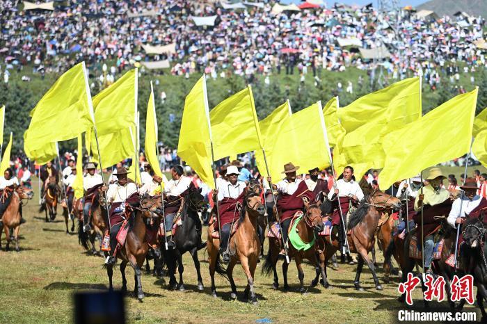 8月4日,藏族騎手在當(dāng)周草原上表演馬隊巡游。當(dāng)日,第22屆九色甘南香巴拉旅游藝術(shù)節(jié)在甘肅省甘南藏族自治州當(dāng)周草原開幕。人們身著節(jié)日盛裝載歌載舞、歡聚一堂,馬隊巡游、千人鍋莊舞等活動精彩上演。九色甘南香巴拉旅游藝術(shù)節(jié)既是民眾浪山聚會的節(jié)日盛會,也是展現(xiàn)發(fā)展成就、擴大對外開放的重要窗口,更是展示民俗文化、促進(jìn)廣泛交往交流交融的有效載體。中新社記者 九美旦增 攝
