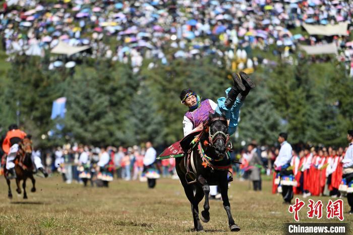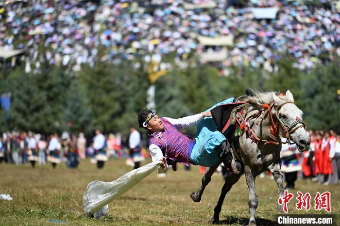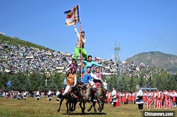 8月4日,藏族騎手在當(dāng)周草原上表演馬術(shù)。當(dāng)日,第22屆九色甘南香巴拉旅游藝術(shù)節(jié)在甘肅省甘南藏族自治州當(dāng)周草原開幕。人們身著節(jié)日盛裝載歌載舞、歡聚一堂,馬隊巡游、千人鍋莊舞等活動精彩上演。九色甘南香巴拉旅游藝術(shù)節(jié)既是民眾浪山聚會的節(jié)日盛會,也是展現(xiàn)發(fā)展成就、擴大對外開放的重要窗口,更是展示民俗文化、促進(jìn)廣泛交往交流交融的有效載體。中新社記者 九美旦增 攝