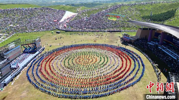 8月4日,第22屆九色甘南香巴拉旅游藝術(shù)節(jié)在甘肅省甘南藏族自治州當(dāng)周草原開幕。人們身著節(jié)日盛裝載歌載舞、歡聚一堂,馬隊巡游、千人鍋莊舞等活動精彩上演。九色甘南香巴拉旅游藝術(shù)節(jié)既是民眾浪山聚會的節(jié)日盛會,也是展現(xiàn)發(fā)展成就、擴大對外開放的重要窗口,更是展示民俗文化、促進(jìn)廣泛交往交流交融的有效載體。圖為開幕式現(xiàn)場千人鍋莊舞表演。(無人機照片)中新社記者 九美旦增 攝