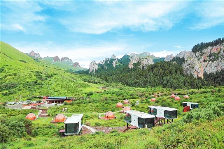 夏河縣的桑科草原上,游人在山間草場(chǎng)、樹(shù)林河邊支起一頂頂帳篷,白天品著飄香的奶茶,晚上躺在草地上仰望星空,很是愜意。