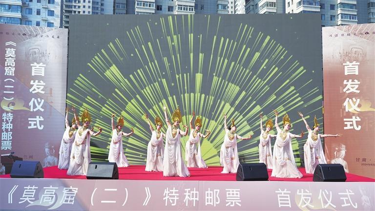 敦煌文化博大精深,敦煌舞蹈美輪美奐。首發(fā)儀式上,舞者身著飄逸的古裝,頭戴華麗的發(fā)飾,手持飄帶,仿佛從天而降的仙子。她們在音樂的伴奏下,翩翩起舞,輕盈如燕,婉約如風,一曲《千手觀音》拉開了《莫高窟(二)》特種郵票發(fā)行儀式的序幕。