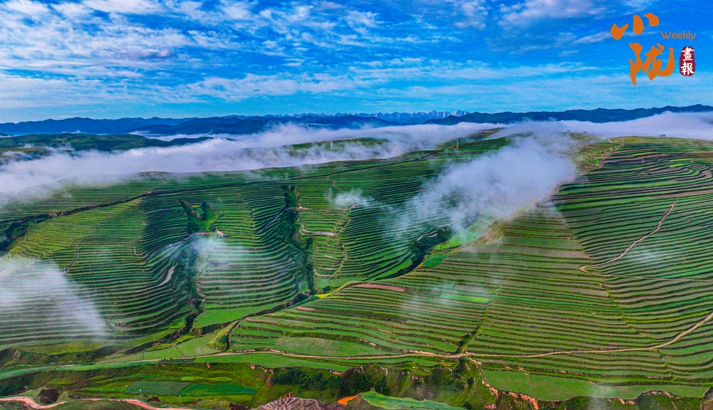 萬(wàn)畝碧綠的梯田從山腳盤(pán)繞著直至山頂,高低錯(cuò)落,層層疊疊伸向遠(yuǎn)方,遠(yuǎn)遠(yuǎn)望去,像“條縷清晰”的調(diào)色板,在藍(lán)天白云的打扮下,壯現(xiàn)絢爛。
