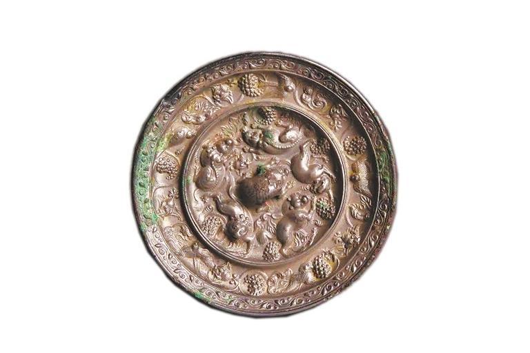 我省天水市博物館的眾多藏品中,有一面海獸葡萄紋銅鏡,大致出現(xiàn)于武則天執(zhí)政時期(684年—705年)。銅鏡上五只瑞獸作匍匐狀,攀援著葡萄枝蔓,這里的海獸就是來自西域的獅子,古人稱為“狻猊”。此外鏡上葡萄藤葉鋪陳、點(diǎn)綴著禽鳥和卷草,精美絕倫,彰顯著大唐開放包容的盛世氣象。
