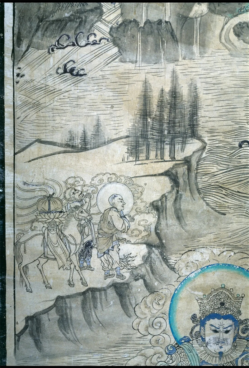 敦煌壁畫(huà)中現(xiàn)存六幅唐僧取經(jīng)圖,其中時(shí)代最早、保存最完好的一幅繪于西夏時(shí)期榆林窟第3窟的《普賢變》中。此幅唐僧取經(jīng)圖似是唐僧師徒在取經(jīng)途中遭遇難關(guān),誠(chéng)心祈求菩薩協(xié)助渡難。圖中,唐僧身披袈裟,雙手合十,彎腰向前,遙望普賢菩薩參拜。唐僧身后,長(zhǎng)相似猴的人雙手合十,抬頭仰望,向普賢致禮,他就是孫悟空的原型——石磐陀。師徒身后有一匹白馬,靜立等待。他們站在懸崖深壑前,面前呈現(xiàn)山窮水盡已無(wú)路的困境。