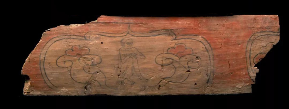 彩繪“猴”生肖木版畫(huà),唐代,一級(jí)文物。1979年肅南縣大長(zhǎng)嶺唐墓出土。木版畫(huà)長(zhǎng)73厘米,寬22厘米,猴生肖木版畫(huà)呈長(zhǎng)方形,墨筆雙線勾勒一壸門(mén)開(kāi)光。壸門(mén)內(nèi)墨線勾勒一猴,其雙手環(huán)抱膝蓋至胸前,猴身兩側(cè)繪有兩朵升騰祥云。壸門(mén)外飾以土紅色。