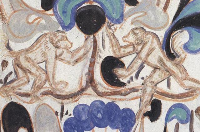 在這一壁畫(huà)中共畫(huà)了五只猴子,其中有兩只猴子在有摩尼寶珠的蓮花下面玩耍,猴子尾巴高高翹起,尖嘴大臉,似乎在用手攀折蓮枝,畫(huà)面構(gòu)圖簡(jiǎn)練生動(dòng)。