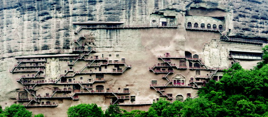麥積山石窟與敦煌莫高窟、大同云岡石窟、洛陽(yáng)龍門石窟齊名,是中國(guó)四大石窟之一,被譽(yù)為“東方雕塑陳列館”。公元759年杜甫流寓天水,作《山寺》詩(shī):“野寺殘僧少,山園細(xì)路高。麝香眠石竹,鸚鵡啄金桃。亂石通人過(guò),懸崖置屋牢。上方重閣晚,百里見秋毫。”其自然景觀與人文景觀完美結(jié)合,是世界文化遺產(chǎn)、全國(guó)重點(diǎn)文物保護(hù)單位,也是中原北方地區(qū)最早的皇家石窟,洞窟內(nèi)還保存了中國(guó)最早的連環(huán)畫作品。