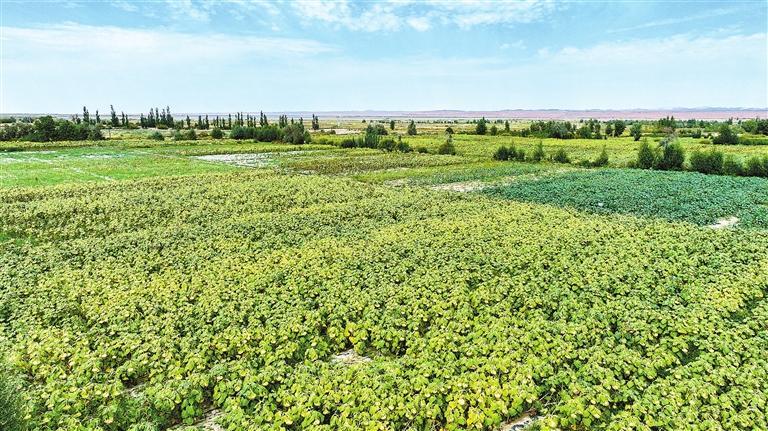 金塔縣航天鎮(zhèn)營盤村重度鹽堿耕地綜合治理利用核心示范點(diǎn)綠意盎然,向日葵、蓖麻、高粱等作物長勢(shì)喜人。