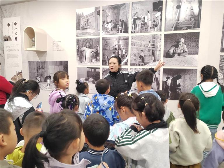 為了使小朋友們能夠身臨其境感受敦煌文化的魅力,主持人還為每一位小朋友發(fā)放了一本“敦煌小畫師”的研學手冊,并帶領大家前往蘭州市圖書館“近鄰”——敦煌藝術(shù)館進行了一場藝術(shù)研學之旅。在敦煌藝術(shù)館內(nèi),孩子們見證了第220號石窟的壯觀,欣賞了館內(nèi)200余件文化展品,追溯了莫高窟的歷史淵源,了解了壁畫繪制和建筑元素的藝術(shù)審美,學習了“壁上丹青”的顏料密碼。