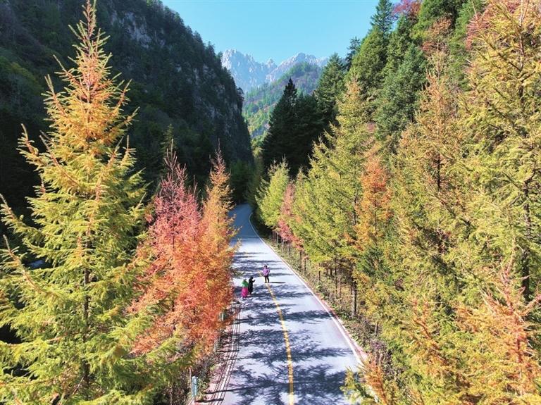 金秋時節(jié),位于宕昌縣的官鵝溝國家森林公園秋色盡染,斑斕如畫。