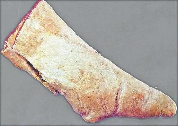 現(xiàn)代考古發(fā)現(xiàn)已證實,早期人們穿的襪子確為皮襪。目前存世較早的一雙襪子是公元前九世紀(jì)的皮氈(zhān)襪,出土于新疆塔里木盆地南緣扎洪魯克古墓中。