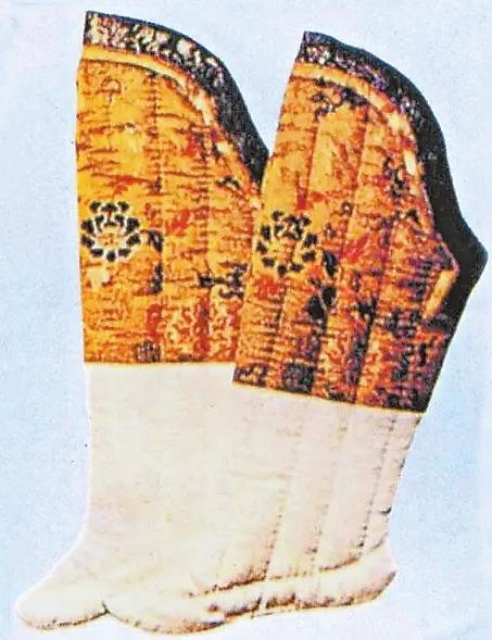 漢代的“夾襪”就是一種棉襪,這種襪子較單層襪厚實,里外兩層,故名。湖南長沙馬王堆漢墓中曾出土過兩雙夾襪,由雙層素絹縫成,襪面用絹較細,襪里用絹較粗。這是女襪,出土?xí)r放置在棺木邊箱的竹笥之內(nèi),從襪子當(dāng)隨葬品來分析,那時襪子已是生活中必備衣物。