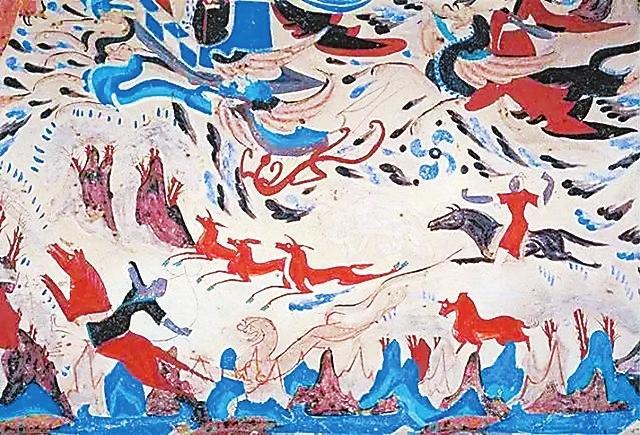 在莫高窟第249窟壁畫中有一幅“行獵圖”:畫面上都是些體型巨大的動物,有體態(tài)矯健的猛虎、疾馳俊逸的鹿群、整裝待發(fā)的獅子等,有在奔馳的駿馬上拈弓搭箭窮追不舍的獵人,還有在飛奔的駿馬上淡定轉(zhuǎn)身從容射虎的獵人。整個畫面既緊張又美好,使人不由得對畫師精湛的技藝心悅誠服。唐代詩人王維在詩作《觀獵》中寫道:“風勁角弓鳴,將軍獵渭城。草枯鷹眼疾,雪盡馬蹄輕。忽過新豐市,還歸細柳營?;乜瓷涞裉帲Ю锬涸破?。”意思是說將軍的獵騎,飛馳在渭城的近郊。風中傳來呼嘯的弦聲。已枯的野草,擋不住尖銳敏捷的鷹眼,積雪后飛馳的駿馬馬蹄會愈加輕盈。據(jù)文獻記載,唐宋時期人們打獵時多有一種“西北望,射天狼”的豪情!在莫高窟第85窟壁畫中還有一幅“行獵圖”就形象地反映了唐人狩獵的情景:畫面上的四個健碩獵人正在整裝出獵,他們著裝統(tǒng)一:頭戴幞頭,身穿缺胯衫,足蹬半腰靴。打獵的裝備也很不同:有人胳臂上架鷹、有人單手牽犬、有人持弓挎箭囊,甚至還有一人手持利斧。