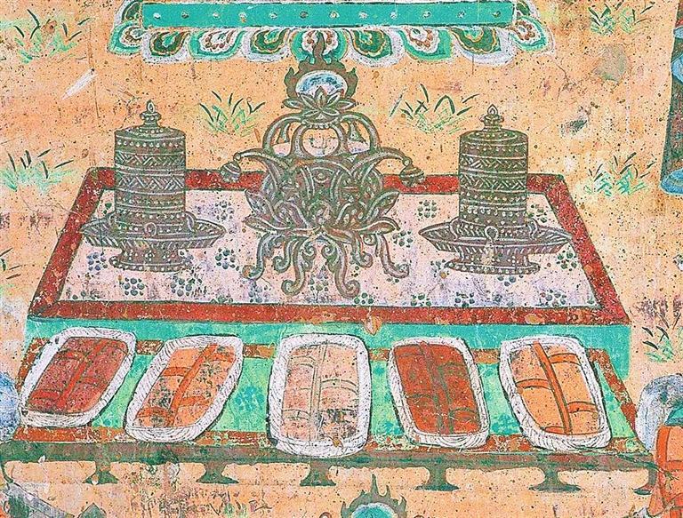 宋朝詩人陸游在《食粥》一詩中寫道:“世人個個學長年,不悟長年在目前。我得宛丘平易法,只將食粥致神仙。”意思是說人人都期盼長壽,怎么也沒有想到,我就成了長壽之人。如果讓我總結(jié)一下我長壽的秘訣,那就是我喝的粥多而已。想想冬天到了,天寒地凍,喝碗粥,渾身上下暖烘烘的多美啊。可是在敦煌壁畫里,人們在冬季不是喝粥,而是喝熱牛奶。在莫高窟第146窟壁畫中有一幅“擠牛奶圖”:畫面上一頭健碩的母牛正在被人擠奶,它回首望向擠奶者。在它的身下,還有一只小牛犢正貪婪地望著擠奶者。兩頭牛都憨態(tài)可掬、萌蠢可愛。漫天飛雪中,煮沸的牛奶溫暖著漫長冬季的每時每刻。在莫高窟第302窟中有一幅“湯水浴圖”。湯水就是溫泉。畫面上在樹木掩映之下有一池溫泉,有一大一小兩個人正沉浸在溫泉沐浴的歡快之中??梢?,伴著紛飛的大雪泡個溫泉,不是只有今天才有的享受;在千年之前的敦煌,人們就已經(jīng)開始修建溫室浴池,而且引水排水的技術(shù)已經(jīng)較為完善。院落依依、親朋融融、池水湯湯、筋骨軟軟,逸興悠悠。