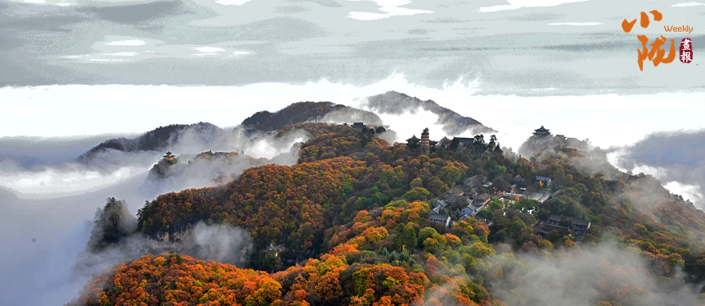 云霧繚繞,金黃的葉子似金色海洋,覆蓋山脈,在陽光照耀下散發(fā)著溫暖光芒,仿佛為崆峒山披上了璀璨外衣。