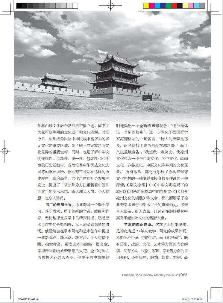 收入這本書的126篇文章,看似是一個個獨立的篇章,但貫通起來看卻是涼州文化的萬千姿態(tài)和時代價值,構成了一部視角新穎、邏輯嚴謹、觀點鮮明、體系完整的涼州文化圖譜,并響亮提出了一個文化傳承發(fā)展的宏大命題——如何重新認識、定位、構建中華文明格局下的涼州文化。這 126 篇文章,可以說是徐兆壽連續(xù)不斷地寫給故鄉(xiāng)涼州的126封信,是一名赤誠的游子對故鄉(xiāng)的心靈獨白,是一名學者、教授、作家對弘揚涼州文化的真情呼喚,是一名有高度文化自信的知識分子對文化傳承發(fā)展的責任擔當??v覽全書,給人無窮的遐思和無限的向往。