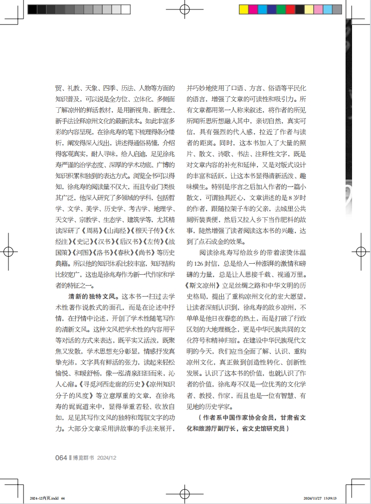豐富的知識體系。這本學術性隨筆集,是徐兆壽近20年來教學、研究的成果體現(xiàn),不但學術性強、抒情性濃,而且知識面廣,既有歷史、政治、文化、藝術等方面的內(nèi)容解讀,又有民風、民俗、家訓、家教等方面的常識介紹,還有民居、服飾、飲食、農(nóng)耕、商貿(mào)、禮教、天象、四季、歷法、人物等方面的知識普及,可以說是全方位、立體化、多側(cè)面了解涼州的鮮活教材,是用新視角、新理念、新手法詮釋涼州文化的最新讀本。如此豐富多彩的內(nèi)容呈現(xiàn),在徐兆壽的筆下梳理得條分縷析,闡發(fā)得深入淺出,講述得通俗易懂,介紹得客觀真實,耐人尋味,給人啟迪,足見徐兆壽嚴謹?shù)闹螌W態(tài)度、深厚的學術功底、廣博的知識積累和獨到的表達方式。瀏覽全書可以得知,徐兆壽的閱讀量不僅大,而且專業(yè)門類極其廣泛,他深入研究了多領域的學科,包括哲學、文學、美學、歷史學、考古學、地理學、天文學、宗教學、生態(tài)學、建筑學等,尤其精讀深研了《周易》《山海經(jīng)》《穆天子傳》《水經(jīng)注》《史記》《漢書》《后漢書》《左傳》《戰(zhàn)國策》《河圖》《洛書》《春秋》《尚書》等歷史典籍。所以他的知識體系比較豐富,知識結(jié)構比較寬廣,這也是徐兆壽作為新一代作家和學者的特征之一。