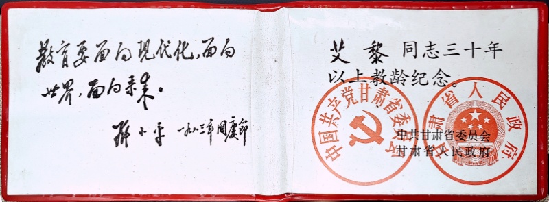 這是一本從教滿三十年的榮譽證書。由中共甘肅省委、甘肅省人民政府頒發(fā)。證書內(nèi)頁的左側(cè)是鄧小平1983年國慶節(jié)題寫的“教育要面向現(xiàn)代化,面向世界,面向未來”。右側(cè)是“艾黎同志三十年以上教齡紀念”。“三個面向”是為北京景山學校的題詞,是鄧小平提出的教育發(fā)展改革方針,旨在推動中國的教育現(xiàn)代化進程,使其更加開放和適應未來發(fā)展的需要,面向世界,吸收國際先進的教育理念和經(jīng)驗;同時展望未來,培養(yǎng)適應未來社會需要的人才。