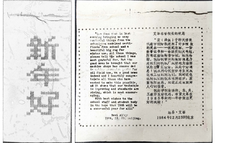 證書是由石油工業(yè)部培黎石油技校申報的。1984年12月30日,培黎石油技校自制的新年賀卡內(nèi)頁用中英文印上了名譽校長艾黎的祝愿: