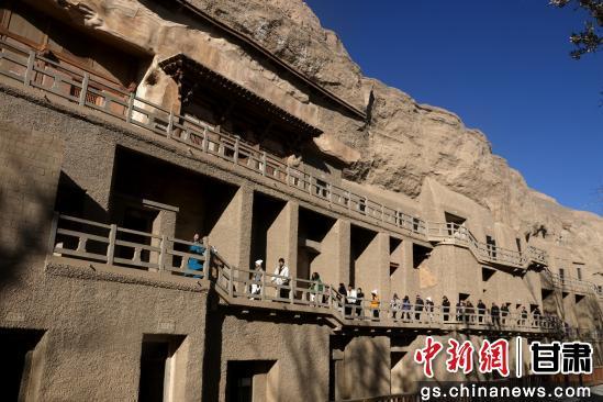 初冬時(shí)節(jié),游客走進(jìn)世界文化遺產(chǎn)甘肅敦煌莫高窟欣賞燦爛的石窟藝術(shù),品味悠久的敦煌歷史文化。