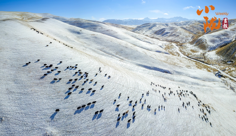 牛群在雪地中悠閑地覓食,和雪景相映成趣,給這片寧?kù)o的草原帶來了生機(jī)與活力。