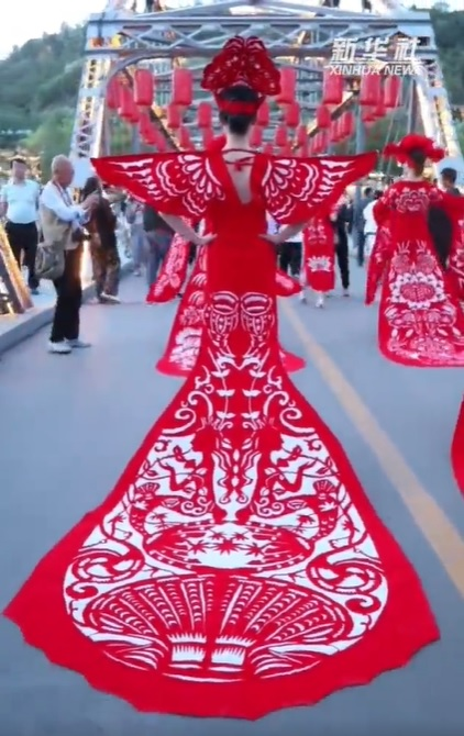 慶陽剪紙源于生活、講究情趣,是勞動人民生產(chǎn)生活、情感氣質(zhì)、觀念習俗和文化傳承的結(jié)晶。著名民俗學家靳之林先生稱剪紙藝人是“真正的藝術(shù)家”。1986年,中央美術(shù)學院邀請鎮(zhèn)原縣民間美術(shù)大師祁秀梅赴北京進行民間美術(shù)教學交流,向大學生演示民間剪紙。法國、日本、澳大利亞等國家的藝術(shù)家也多次專程到隴東考察民間剪紙藝術(shù)。慶陽剪紙已由鄉(xiāng)村婦女手中的小玩意,堂而皇之地步入了國家藝術(shù)殿堂——中國民間美術(shù)館,并在日、意、澳等國家展覽亮相。圖為身著慶陽剪紙服裝的模特們行走在蘭州中山橋上,驚艷了來往的游客。