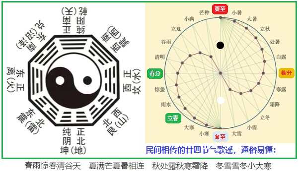 八卦是中華先民理性思維和高度智慧的結(jié)晶。華夏7000年前伏羲創(chuàng)制的八卦圖最初是用來分時紀年的,而在此基礎(chǔ)上發(fā)展起來的廿四節(jié)氣后來卻大放異彩。所謂“太極生兩儀,兩儀生四象,四象生八卦”的陰陽變化,其實指的就是四季輪替,它代表了事務孕育、發(fā)展、成熟和衰亡的自然規(guī)律,告訴世人“變化,才是永恒不變的規(guī)律”這一本質(zhì)!如果在八卦圖上繼續(xù)往下切分,就能很自然地從八卦圖上得到廿四節(jié)氣(見圖)。