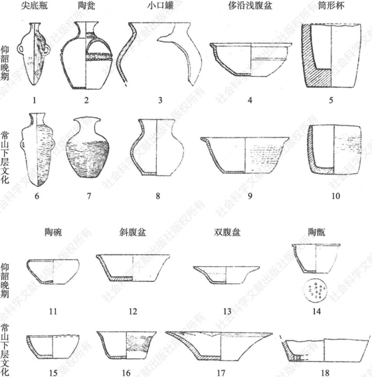 在文化傳承方面,以往認為甘肅東部地區(qū)原始文化發(fā)展序列是從仰韶文化經(jīng)馬家窯文化(含石嶺下、馬家窯、半山和馬廠四個類型)再到齊家文化,且常山下層文化源于馬家窯文化馬家窯類型。近年郎樹德先生提出新序列是老官臺文化(大地灣遺址一期)→仰韶文化早期(半坡類型、大地灣遺址二期)→仰韶文化中期(廟底溝類型、大地灣遺址三期)→仰韶文化晚期(大地灣遺址四期)→常山下層文化(大地灣遺址五期)→齊家文化,認為常山下層文化源頭是仰韶文化而不是馬家窯文化,且是齊家文化的重要源頭之一,糾正了齊家文化是馬家窯文化馬廠期發(fā)展來的不嚴謹說法,還認為隴東地區(qū)沒有齊家文化的遺存,類似齊家的器物其實就是常山下層文化。還有學者認為寧夏南部的“齊家文化”(菜園文化)與典型齊家文化有差異,且與常山下層文化更接近,應歸屬于此。但學界普遍認為常山下層文化繼承仰韶文化之后,在向西擴展過程中,與當?shù)赝林幕嗷ソ蝗?,逐漸演變?yōu)楠毦咛厣牡胤椒种?。從考古發(fā)現(xiàn)來看,常山下層文化應屬龍山早期文化遺存,在發(fā)展進程中,與關中地區(qū)的案板三期文化相互交流,同時向東對客省莊二期文化的形成產(chǎn)生了一定影響。不可否認,齊家文化在形成過程中,受到客省莊二期文化和馬廠文化的深刻影響,呈現(xiàn)出多元融合的態(tài)勢。故而,1979年常山遺址的發(fā)掘及“常山下層文化”的命名,為探尋渭河流域仰韶文化的發(fā)展走向以及齊家文化的起源,開辟了全新路徑,為構(gòu)建甘肅東部地區(qū)新石器考古文化編年體系提供了關鍵依據(jù)。