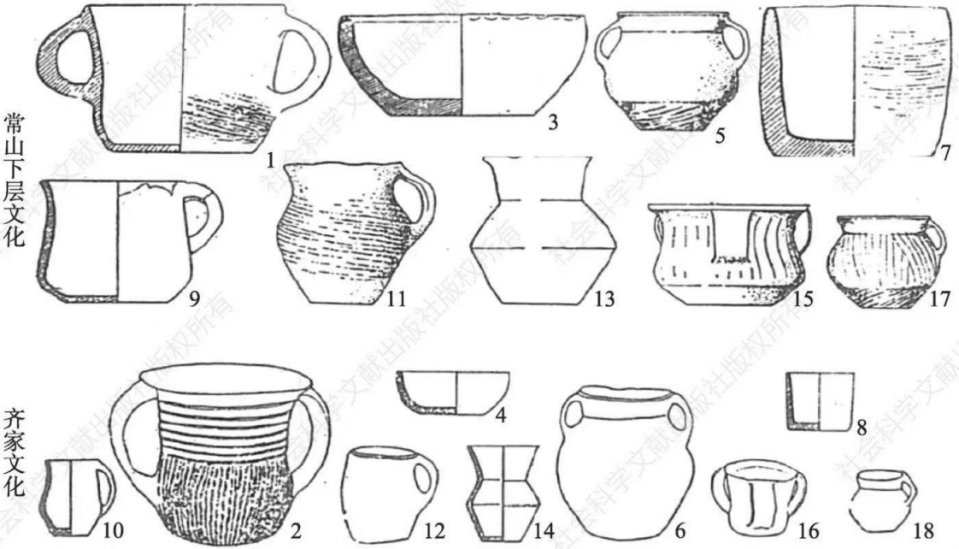 常山下層文化過去限于資料太少,對其研究進展緩慢,近年來很多學者研究有了新的突破。陶器在常山下層文化中獨具特色,橙黃色、紅褐色陶器搭配斜行籃紋,成為其顯著特征。諸多齊家文化器物,如豎行籃紋單耳罐、單耳杯、雙耳杯、侈口罐等,皆可在常山下層文化中尋得淵源,胡謙盈據(jù)此提出“常山下層文化是齊家文化的重要來源”,張忠培亦認為,常山下層文化的提出,有力推動了齊家文化淵源的研究。不過,學界對于齊家文化的起源尚存爭議,有人認為齊家文化是馬廠類型的的延續(xù)與發(fā)展,也有人認為是獨立發(fā)展而成,還有人認為是馬家窯文化發(fā)展到馬廠類型后分東西兩支,一支發(fā)展為河西的四壩文化,一支發(fā)展為齊家文化。韓建業(yè)先生認為齊家文化應當是客省莊二期文化西進隴東南并與菜園文化融合的結(jié)果,齊家文化早期的絕對年代約在公元前 2400-前 2200 年,這個時段在中國內(nèi)地屬于銅石并用時代晚期,分布在天水一帶的遺存是齊家文化早期階段,常山下層文化絕對年代約在公元前2700-前2400年,相當于廟底溝二期階段,再向下就屬于齊家文化早期階段。 近年來,大多學者提出齊家文化源頭大致在隴東及寧夏南部,由東向西漸進擴展。