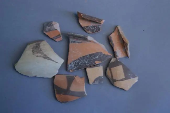 常山下層陶器的籃紋、彩陶和彩繪獨具特色。籃紋均橫行或斜行施于器壁,常見籃紋窄小且拍印深,可能是黃土高原溝壑地帶稀樹叢林藤條編織器物在陶器紋飾上的獨特反映。籃紋陶器大多器型精美且較大,如橙黃色籃紋高領深腹罐,當屬上流社會使用的器物。彩陶以赤砂石為顏料,因顏料調(diào)和濃度大且未經(jīng)壓磨,棕紅色彩紋直接裸露于器皿壁面,與仰韶、馬家窯等文化彩陶著彩后壓磨光滑的工藝截然不同。彩繪所用顏料與色澤雖與彩陶相同,但彩繪施于燒制后的器皿上,極易脫落。