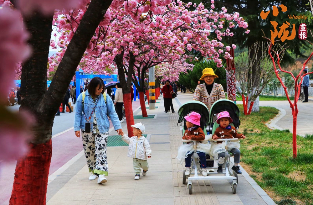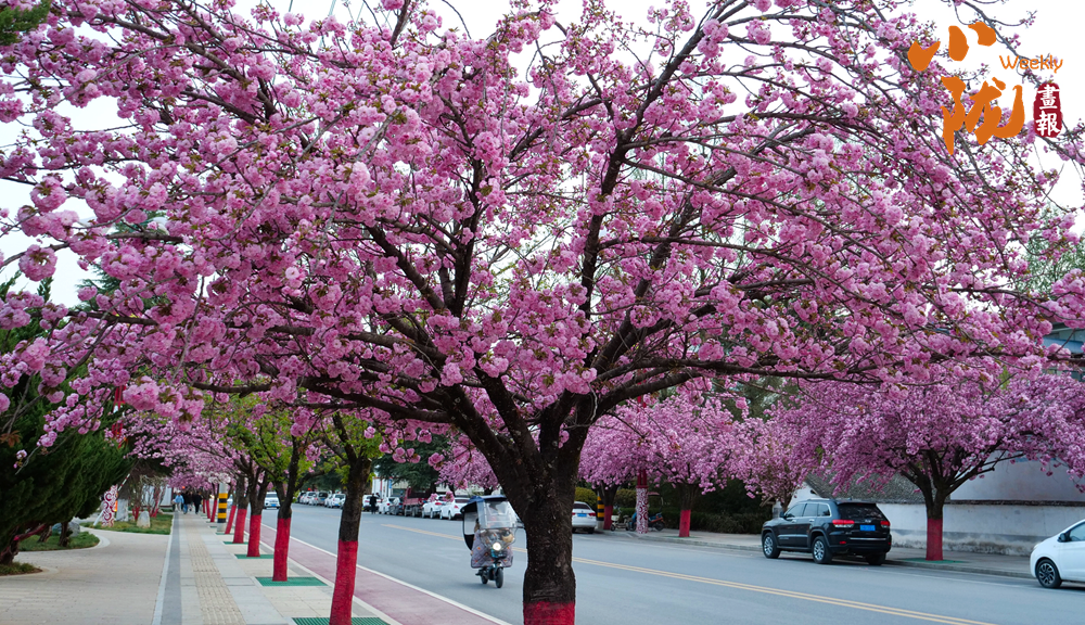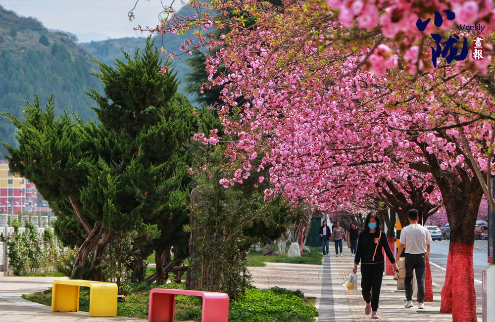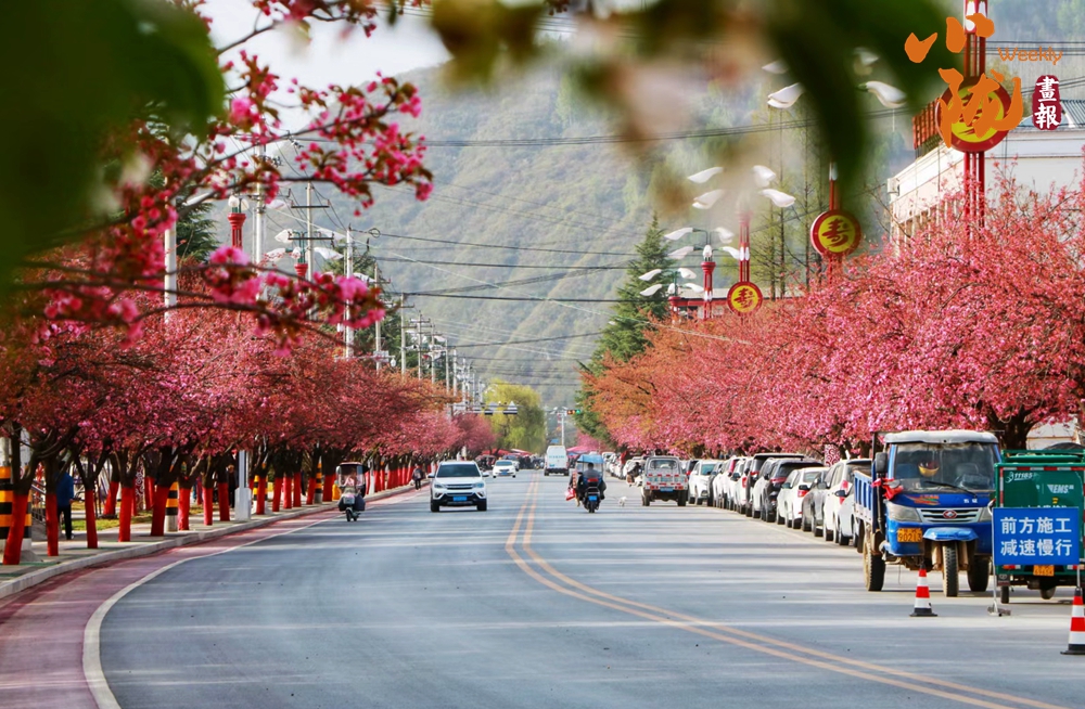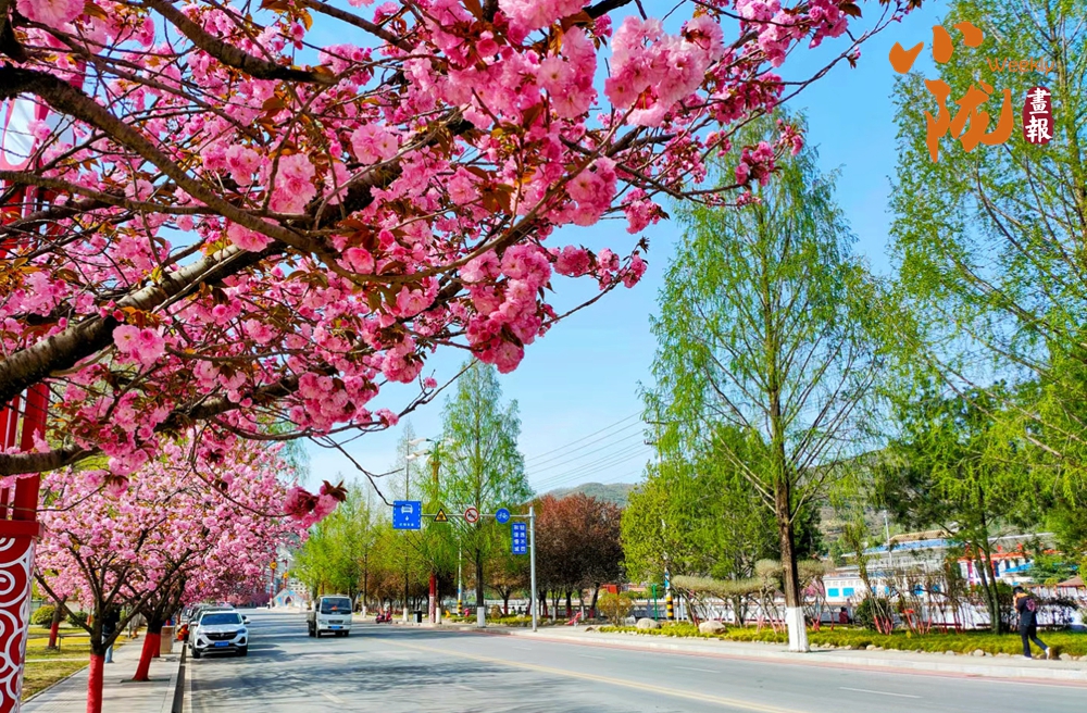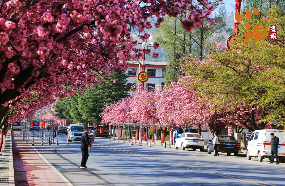 街道兩旁紅綠相映,濕潤的空氣中飄散著櫻花的淡淡芬芳,藍(lán)天澄澈如洗,青山如黛,綠水潺潺,形成“一街一景”的綠化格局,為市民打造了觸手可及的“詩與遠(yuǎn)方”。