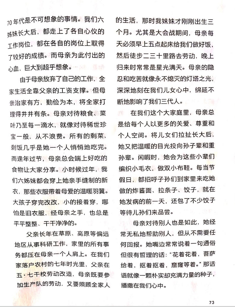 父親長年在草原、高原等偏遠(yuǎn)地區(qū)從事科研工作,家里的所有事務(wù)都壓在母親一個(gè)人肩上。在我們家落戶農(nóng)村的七年時(shí)光里,父親在五·七干校勞動(dòng)改造,母親既要參加生產(chǎn)隊(duì)的勞動(dòng),又要照顧全家人的生活,那時(shí)我妹妹才剛剛出生三個(gè)月。尤其是大會戰(zhàn)期間,母親每天必須早上五點(diǎn)起床給我們做好飯,然后徒步二三十里路去勞動(dòng),晚上歸來時(shí)常常是星光滿天。母親的隱忍和吃苦就像永不熄滅的燈塔之光,深深地刻在我們兒女心中,綿延不斷地影響了我們?nèi)恕?/p>