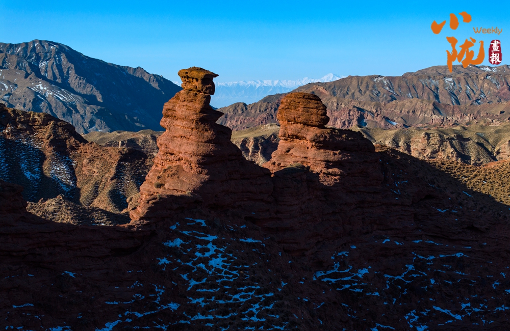 紅色丹霞被春雪覆蓋,在陽光的照耀下,紅色山崖層層疊疊、縱橫交錯,皚皚白雪點綴其中,唯美壯觀。平山湖的山,就在這樣悄無聲息的雪中,幻化成了氣勢磅礴的丹霞,綿延千里,浩瀚無邊。