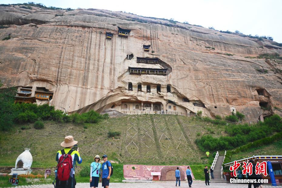 6月23日,游人參觀位于甘肅省張掖市肅南裕固族自治縣祁連山下的馬蹄寺石窟。