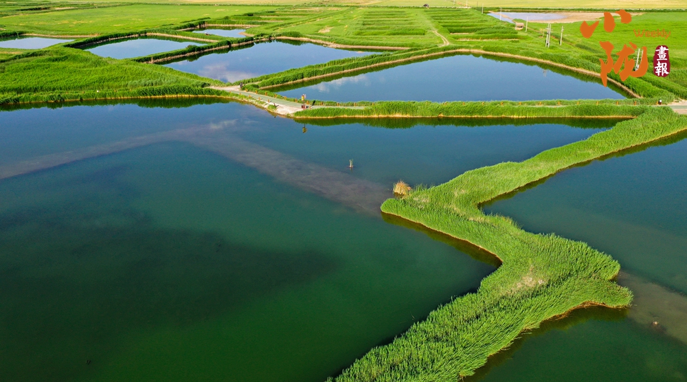 湖邊,蘆葦綠意盎然,隨風泛起綠色的波浪,染翠了整個草湖。每當風兒掠過,這些層層疊疊的綠意散發(fā)出沁人肺腑的草木清香。在這樣炎熱的日子里,看看這樣清澈的綠,夏天好像變得清涼起來。