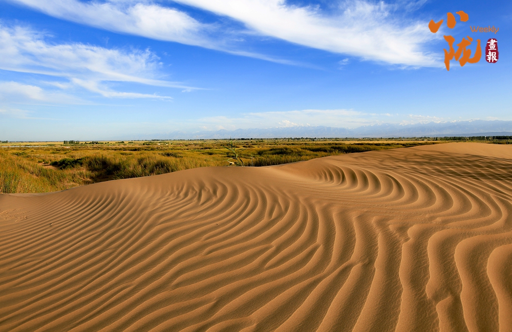 站在綠洲與大漠的結合處,觀賞四方風景,眼前奇異的景致讓人驚嘆萬分:一邊是莽莽蒼蒼、雄渾博大、無邊無際的大漠海洋,一邊是郁郁蔥蔥、娟秀嫵媚的綠洲碧野。這是大自然杰出的造化,這黃色與綠色之間沒有任何過渡,兩色卻形成鮮明的對比,宛如畫家手下的色盤,黃綠分明、對比強烈而又和諧統(tǒng)一,令人叫絕?!?/p>