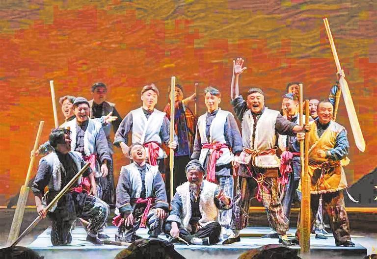 《大河?xùn)|流》的題材構(gòu)成呈現(xiàn)出鮮明的復(fù)合型特征,其核心在于將黃河文化、甘肅地域特色、抗戰(zhàn)歷史與家族倫理熔鑄為一體。劇中,黃河既是地理坐標(biāo),更是文化符號。從開場的“黃河號子”到貫穿全劇的羊皮筏子,從金城關(guān)、黃河鐵橋的舞臺化呈現(xiàn)到地游子步、風(fēng)擺柳等隴劇特有的身段程式,黃河的自然景觀與人文精神被轉(zhuǎn)化為舞臺符號。