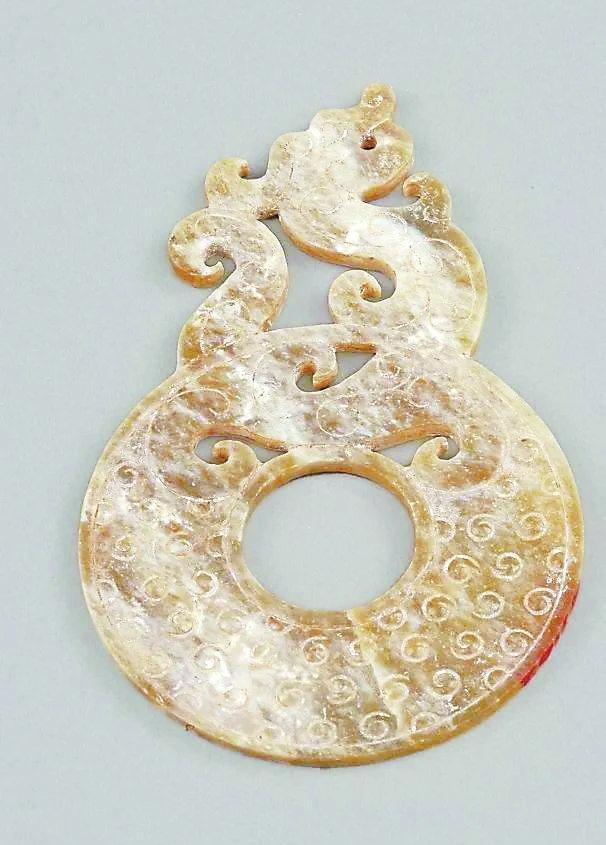 玉璧通高11厘米、直徑6.9厘米、孔徑2.4厘米、厚0.4厘米,征集品。玉料為青玉,整體顏色為青灰色,有灰白沁。琢磨成形,體呈平片狀。下部呈圓形,中有圓孔,孔徑小于肉寬,三分之二雕稀疏谷紋。龍首與龍尾出于璧廓之外,腹部鏤雕在璧孔之上的肉部,有三個(gè)一端彎鉤的三角狀鏤孔,其中下部?jī)蓚€(gè)鏤孔左右對(duì)稱。龍昂首,軀體屈曲,尾部卷而上貼首后,有騰空而起之勢(shì)。龍首尾之間有一個(gè)不規(guī)則的大鏤孔,龍嘴上有一圓形小系孔。