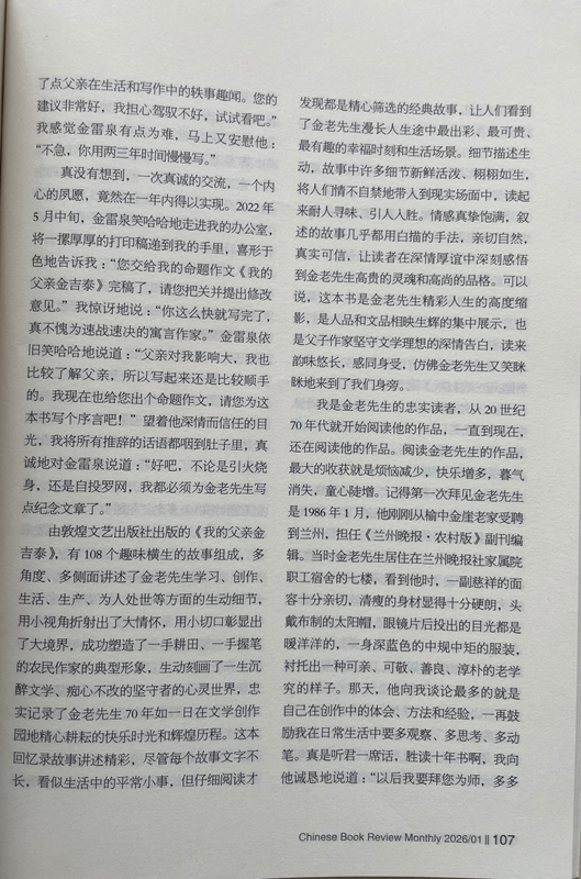 由敦煌文藝出版社出版的《我的父親金吉泰》,有108個(gè)趣味橫生的故事組成,多角度、多側(cè)面講述了金老先生學(xué)習(xí)、創(chuàng)作、生活、生產(chǎn)、為人處世等方面的生動(dòng)細(xì)節(jié),用小視角折射出了大情懷,用小切口彰顯出了大境界,成功塑造了一手耕田、一手握筆的農(nóng)民作家的典型形象,生動(dòng)刻畫了一生沉醉文學(xué)、癡心不改的堅(jiān)守者的心靈世界,忠實(shí)記錄了金老先生70年如一日在文學(xué)創(chuàng)作園地精心耕耘的快樂時(shí)光和輝煌歷程。這本回憶錄故事講述精彩,盡管每個(gè)故事文字不長(zhǎng),看似生活中的平常小事,但仔細(xì)閱讀才發(fā)現(xiàn)都是精心篩選的經(jīng)典故事,讓人們看到了金老先生漫長(zhǎng)人生途中最出彩、最可貴、最有趣的幸福時(shí)刻和生活場(chǎng)景。細(xì)節(jié)描述生動(dòng),故事中許多細(xì)節(jié)新鮮活潑、栩栩如生,將人們情不自禁地帶入到現(xiàn)實(shí)場(chǎng)面中,讀起來(lái)耐人尋味、引人入勝。情感真摯飽滿,敘述的故事幾乎都用白描的手法,親切自然,真實(shí)可信,讓讀者在深情厚誼中深刻感悟到金老先生高貴的靈魂和高尚的品格??梢哉f(shuō),這本書是金老先生精彩人生的高度縮影,是人品和文品相映生輝的集中展示,也是父子作家堅(jiān)守文學(xué)理想的深情告白,讀來(lái)韻味悠長(zhǎng),感同身受,仿佛金老先生又笑瞇瞇地來(lái)到了我們身旁。