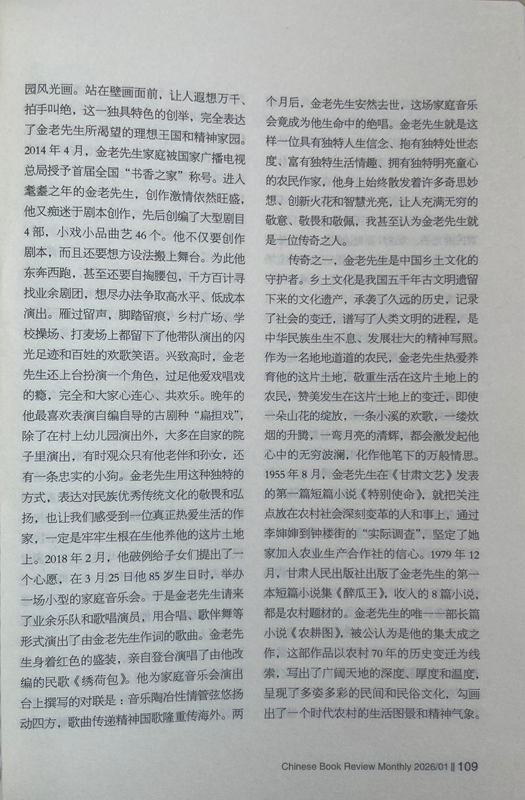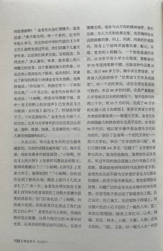 從此之后,我與金老先生的交往越來(lái)越密切,交流的話題也越來(lái)越廣泛,每次見面,他給我最多的就是鼓勵(lì):“小楊啊,你在《人民日?qǐng)?bào)》上發(fā)表的寫奧運(yùn)會(huì)的散文,看得我都激動(dòng)了。”“小楊啊,《詩(shī)刊》上發(fā)表大作了,值得祝賀!”“小楊啊,你的創(chuàng)作達(dá)到了新的水準(zhǔn),都登上國(guó)刊《人民文學(xué)》了。”有一次,金老先生得知我在《星星》詩(shī)刊舉辦的首屆農(nóng)民工詩(shī)歌大獎(jiǎng)賽中獲獎(jiǎng)的消息后,專門打來(lái)電話:“小楊啊,向你表示祝賀,你的獲獎(jiǎng)作品表達(dá)了我們農(nóng)民工的心聲!”金老先生與人相處,傳遞的絕對(duì)是正能量,從我與他交往的30多年時(shí)光里,從來(lái)沒有聽到過(guò)他非議別人。后來(lái)才慢慢發(fā)現(xiàn),他有與眾不同的精神境界、質(zhì)樸品格、為人方式和處事態(tài)度,他靈魂深處永遠(yuǎn)流淌著向善、向上、向真、向美的價(jià)值取向,渾身上下始終洋溢著執(zhí)著、豁達(dá)、樂觀、寬容的人格魅力。一個(gè)地地道道的農(nóng)民,從當(dāng)年只有小學(xué)文化程度,靠勤奮自學(xué)70年堅(jiān)持筆耕不輟,出版各種作品集25部,共計(jì)400多萬(wàn)字,被中共甘肅省委、甘肅省人民政府授予“甘肅省文藝終身成就獎(jiǎng)”。對(duì)一個(gè)農(nóng)民來(lái)說(shuō),這在全國(guó)也是屈指可數(shù)的。年近80歲的時(shí)候,在患嚴(yán)重眼疾幾乎導(dǎo)致雙目失明的情況下,每天堅(jiān)持寫作兩三千字,用10個(gè)月時(shí)間,完成了45萬(wàn)字的長(zhǎng)篇小說(shuō)《農(nóng)耕圖》,榮獲甘肅省文學(xué)藝術(shù)類政府最高獎(jiǎng)——敦煌文藝獎(jiǎng),金老先生的頑強(qiáng)毅力和拼命勁頭也是罕見的。20世紀(jì)80年代初,他以家鄉(xiāng)榆中縣金崖鄉(xiāng)文化站為依托,創(chuàng)辦了全省第一個(gè)農(nóng)民文學(xué)社——苑川文學(xué)社,舉辦“文學(xué)創(chuàng)作講習(xí)班”,吸引方圓村鎮(zhèn)100多名“泥腿子”文學(xué)愛好者參與其中,每當(dāng)經(jīng)他修改、推薦的作品發(fā)表后,年過(guò)半百的他總是騎上自行車跑幾十公里路,喜滋滋地將樣報(bào)樣刊送到作者手里,金老先生樂此不疲為文學(xué)愛好者全方位服務(wù)的情懷,在當(dāng)下是不多見的,更加顯得彌足珍貴。興趣廣泛的金老先生在晚年時(shí)突發(fā)奇想,在老宅院子里啟動(dòng)了家庭美化工程,自己設(shè)計(jì)、自己施工,在自家院子西墻上,用五顏六色的小石子創(chuàng)作了一幅長(zhǎng)八米、寬二米的巨型壁畫,畫面上有紅日、山水、碌碡、西瓜、樹木、小鹿、大雁、人物,還有太陽(yáng)灶、飛機(jī)、衛(wèi)星,好一幅天人合一的田園風(fēng)光畫。站在壁畫面前,讓人遐想萬(wàn)千、拍手叫絕,這一獨(dú)具特色的創(chuàng)舉,完全表達(dá)了金老先生所渴望的理想王國(guó)和精神家園。2014年4月,金老先生家庭被國(guó)家廣播電視總局授予首屆全國(guó)“書香之家”稱號(hào)。進(jìn)入耄耋之年的金老先生,創(chuàng)作激情依然旺盛,他又癡迷于劇本創(chuàng)作,先后創(chuàng)編了大型劇目4部,小戲小品曲藝46個(gè)。他不僅要?jiǎng)?chuàng)作劇本,而且還要想方設(shè)法搬上舞臺(tái)。為此他東奔西跑,甚至還要自掏腰包,千方百計(jì)尋找業(yè)余劇團(tuán),想盡辦法爭(zhēng)取高水平、低成本演出。雁過(guò)留聲,腳踏留痕,鄉(xiāng)村廣場(chǎng)、學(xué)校操場(chǎng)、打麥場(chǎng)上都留下了他帶隊(duì)演出的閃光足跡和百姓的歡歌笑語(yǔ)。興致高時(shí),金老先生還上臺(tái)扮演一個(gè)角色,過(guò)足他愛戲唱戲的癮,完全和大家心連心、共歡樂。晚年的他最喜歡表演自編自導(dǎo)的古劇種“扁擔(dān)戲”,除了在村上幼兒園演出外,大多在自家的院子里演出,有時(shí)觀眾只有他老伴和孫女,還有一條忠實(shí)的小狗。金老先生用這種獨(dú)特的方式,表達(dá)對(duì)民族優(yōu)秀傳統(tǒng)文化的敬畏和弘揚(yáng),也讓我們感受到一位真正熱愛生活的作家,一定是牢牢生根在生他養(yǎng)他的這片土地上。2018年2月,他破例給子女們提出了一個(gè)心愿,在3月25日他85歲生日時(shí),舉辦一場(chǎng)小型的家庭音樂會(huì)。于是金老先生請(qǐng)來(lái)了業(yè)余樂隊(duì)和歌唱演員,用合唱、歌伴舞等形式演出了由金老先生作詞的歌曲。金老先生身著紅色的盛裝,親自登臺(tái)演唱了由他改編的民歌《繡荷包》。他為家庭音樂會(huì)演出臺(tái)上撰寫的對(duì)聯(lián)是:音樂陶冶性情管弦悠揚(yáng)動(dòng)四方,歌曲傳遞精神國(guó)歌隆重傳海外。兩個(gè)月后,金老先生安然去世,這場(chǎng)家庭音樂會(huì)竟成為他生命中的絕唱。金老先生就是這樣一位具有獨(dú)特人生信念、抱有獨(dú)特處世態(tài)度、富有獨(dú)特生活情趣、擁有獨(dú)特明亮童心的農(nóng)民作家,他身上始終散發(fā)著許多奇思妙想、創(chuàng)新火花和智慧光亮,讓人充滿無(wú)窮的敬意、敬畏和敬佩,我甚至認(rèn)為金老先生就是一位傳奇之人。