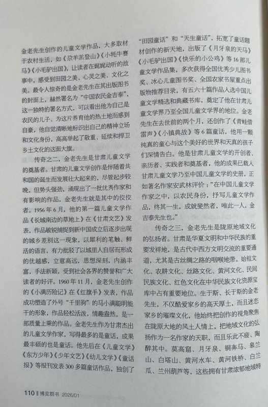 傳奇之二,金老先生是甘肅兒童文學(xué)的奠基者。甘肅的兒童文學(xué)創(chuàng)作是伴隨著共和國(guó)的誕生而發(fā)展壯大起來(lái)的,盡管起步較晚,但勢(shì)頭強(qiáng)勁,涌現(xiàn)出了一批優(yōu)秀作家和有影響的作品,金老先生就是其中的佼佼者。1956年6月,他的第一篇兒童文學(xué)作品《長(zhǎng)城南邊的草地上》在《甘肅文藝》發(fā)表,作品敏銳捕捉到新中國(guó)成立后逐步出現(xiàn)的城鄉(xiāng)差別這一現(xiàn)象,以犀利的筆觸、鮮活的語(yǔ)言,有力批駁了以城里人自居而形成的優(yōu)越感,立意高遠(yuǎn),思想深刻,內(nèi)涵豐富,手法新穎,受到社會(huì)各界的贊譽(yù)和廣大讀者的好評(píng)。1960年11月,金老先生創(chuàng)作的《小滿歷險(xiǎn)記》在《紅旗手》發(fā)表,作品成功塑造了外號(hào)“千里駒”的馬小滿聰明能干的形象,作品輕松活潑,情趣盎然,是一部質(zhì)量上乘的作品。金老先生作為甘肅杰出的兒童文學(xué)作家,寫得最多的是童話,成果最豐碩的也是童話。他先后在《兒童文學(xué)》《東方少年》《少年文藝》《幼兒文學(xué)》《童話報(bào)》等報(bào)刊發(fā)表300多篇童話作品,獨(dú)創(chuàng)了“田園童話”和“天生童話”,拓寬了童話題材創(chuàng)作的新天地,出版了《月牙泉的天馬》《小毛驢出國(guó)》《快樂的小公雞》等16部?jī)和膶W(xué)作品集,多次獲得全國(guó)優(yōu)秀少兒圖書獎(jiǎng)、冰心兒童圖書獎(jiǎng)、全國(guó)農(nóng)家書屋重點(diǎn)出版物推薦目錄,有五六十篇作品入選中國(guó)兒童文學(xué)精選和典藏書庫(kù),奠定了他在甘肅兒童文學(xué)界乃至全國(guó)兒童文學(xué)界的地位。金老先生在去世前的兩個(gè)月,還創(chuàng)作了《青蛙借雷聲》《小鎮(zhèn)典故》等6篇童話,他用一顆純真的童心與這個(gè)美好的世界和天真的孩子們深情告白。他是甘肅兒童文學(xué)的開創(chuàng)者、親歷者、實(shí)踐者和奠基者,他的成果已載入甘肅兒童文學(xué)乃至中國(guó)兒童文學(xué)的史冊(cè),正如著名作家安武林評(píng)價(jià):“在中國(guó)兒童文學(xué)作家之中,以農(nóng)民身份,抒寫兒童文學(xué)作品,終其一生,成就斐然者,唯此一人,金吉泰先生也。”