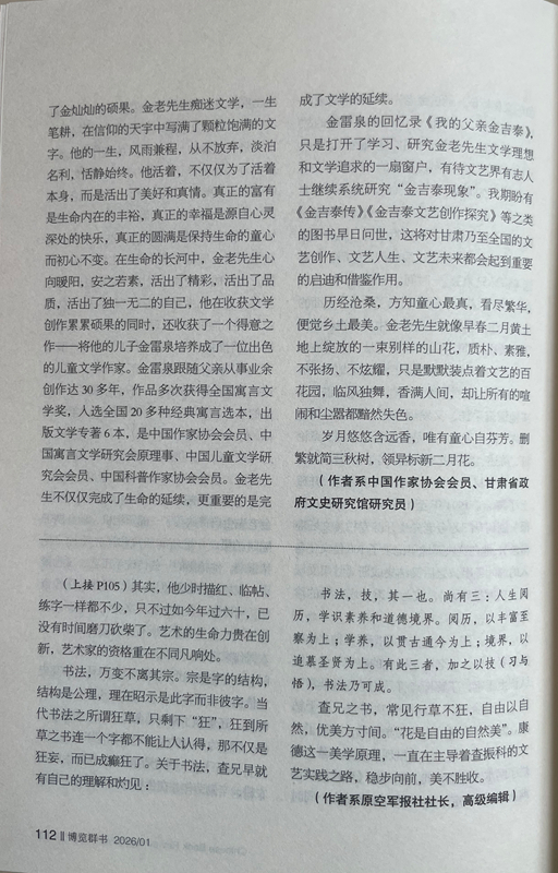 金雷泉的回憶錄《我的父親金吉泰》,只是打開了學(xué)習(xí)、研究金老先生文學(xué)理想和文學(xué)追求的一扇窗戶,有待文藝界有志人士繼續(xù)系統(tǒng)研究“金吉泰現(xiàn)象”。我期盼有《金吉泰傳》《金吉泰文藝創(chuàng)作探究》等之類的圖書早日問世,這將對(duì)甘肅乃至全國(guó)的文藝創(chuàng)作、文藝人生、文藝未來(lái)都會(huì)起到重要的啟迪和借鑒作用。