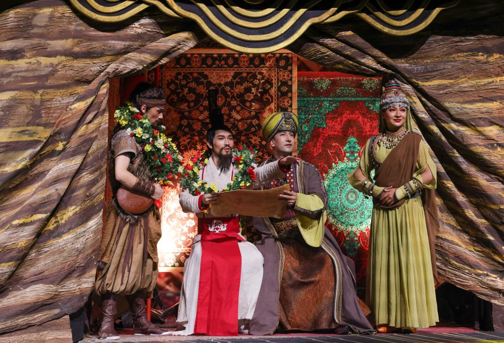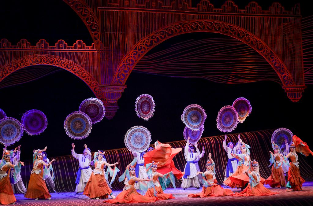 10月27日晚,在烏魯木齊文化中心大劇院,演員在舞劇《張騫》中表演。 10月27日晚,以漢代張騫出使西域為藍本創(chuàng)作的重大歷史題材舞劇《張騫》,在烏魯木齊文化中心大劇院首演。該劇由《授節(jié)》《守節(jié)》《傳節(jié)》《使節(jié)》四幕組成,演繹了張騫出使西域的“鑿空之旅”,展現了各民族廣泛交往、全面交流、深度交融的生動場景。 新華社記者 王菲 攝