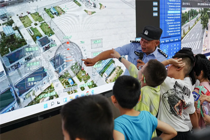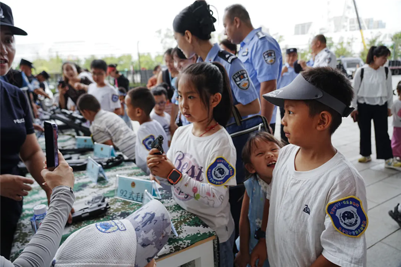 帶著興奮和期待,小朋友們的警營(yíng)探索之旅開始了!在奧體中心警務(wù)站和警航作戰(zhàn)單元,他們沉浸式參觀了現(xiàn)代警務(wù)工作和警用無(wú)人機(jī)的指揮調(diào)度,直觀了解了公安工作的日常場(chǎng)景。另一邊,小朋友們?cè)诿窬闹笇?dǎo)下,一個(gè)個(gè)親手拿著警用武器裝備零距離“拍照打卡”,“這個(gè)好酷!”“看我的!”小朋友們的驚嘆聲此起彼伏。