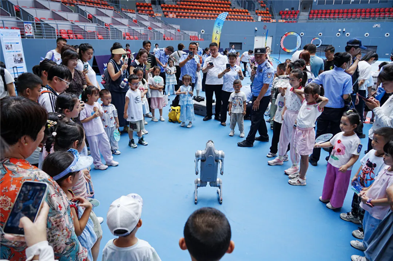 緊接著,在網(wǎng)球館前,大家首先被特警隊(duì)員精彩的防暴小隊(duì)?wèi)?zhàn)術(shù)演練所震撼,矯健的身手贏得了陣陣掌聲。警犬迅猛精準(zhǔn)的撲咬展示更是讓小朋友們連連叫好。警用機(jī)器狗的靈活表演引得大家紛紛上前互動(dòng),最讓小朋友們躍躍欲試的還是無(wú)人機(jī)穿梭器的體驗(yàn)環(huán)節(jié),戴上眼鏡感受著穿梭器的“速度與激情”,孩子們臉上洋溢著喜悅和興奮,近距離感受到了科技在公安工作中的強(qiáng)大應(yīng)用。