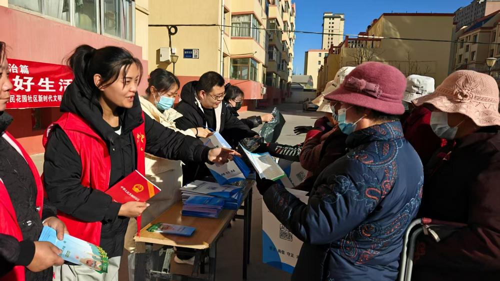 工作人員在社區(qū)內(nèi)開展普法宣傳活動,向居民發(fā)放法律宣傳資料。