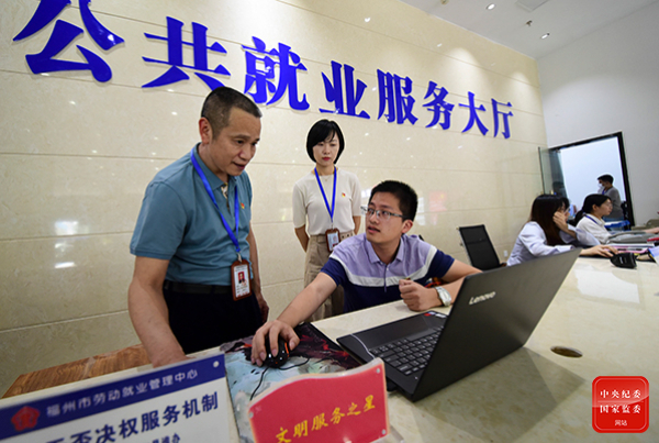 連日來,福建省福州市紀委監(jiān)委駐市委組織部紀檢監(jiān)察組深入市人社局下屬單位、有關(guān)企業(yè)調(diào)研督查“穩(wěn)崗就業(yè)”工作推進落實情況。圖為紀檢監(jiān)察組成員在福州市公共就業(yè)服務(wù)大廳,對相關(guān)工作進行調(diào)研監(jiān)督。李德鄰 攝